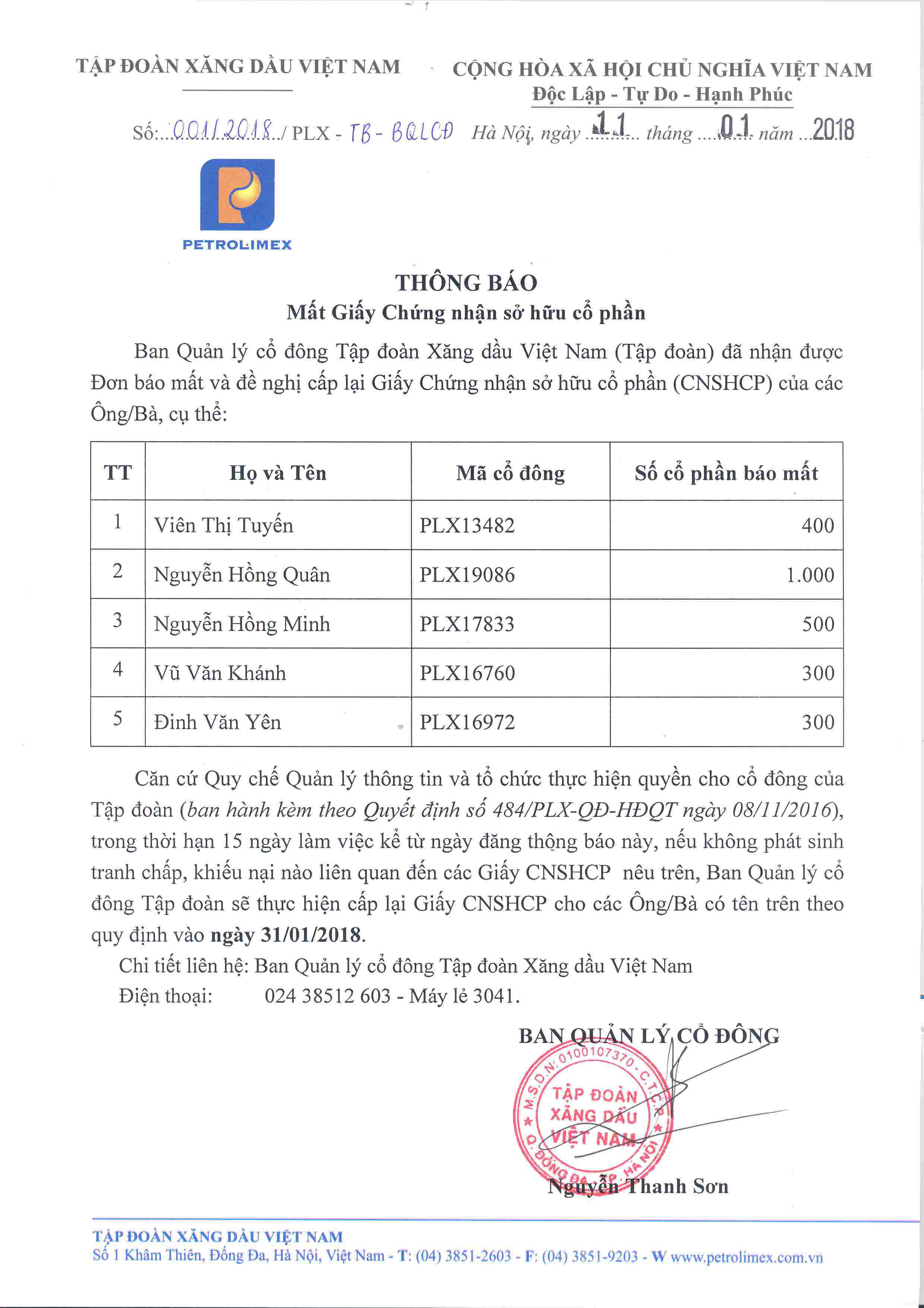 Danh sách chi tiết tạiThông báosố 001/2018/PLX-TB-BQLCĐ ngày 11.01.2018và các mẫu Đơn đề nghị cấp lại GCNSHCP & Giấy đề nghị hiệu chỉnh thông tin - để Quý vị Cổ đông thuận tiện trong tra cứu, sử dụng.