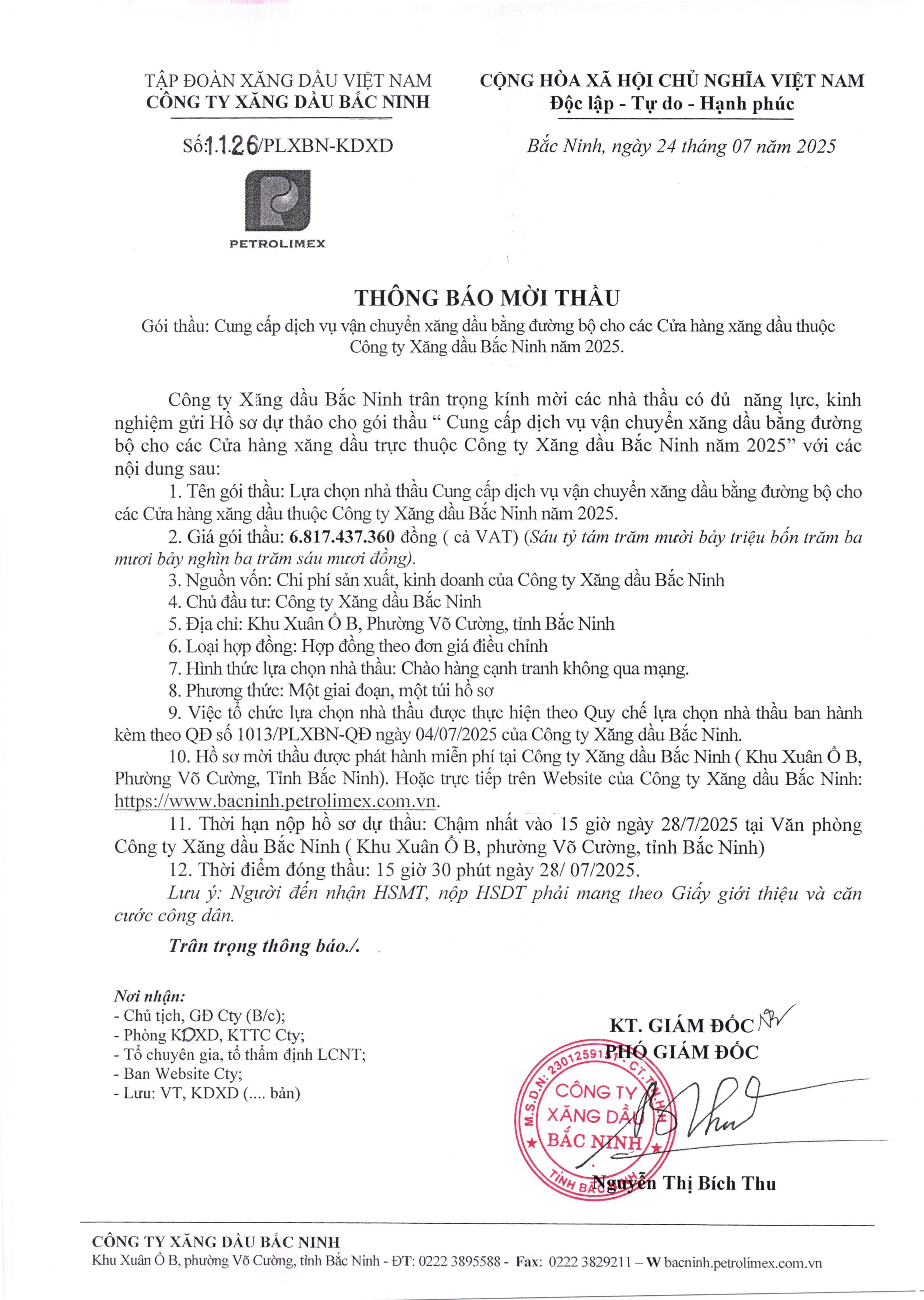 Gói thầu: Cung cấp dịch vụ vận chuyển xăng dầu bằng đường bộ cho các Cửa hàng Xăng dầu thuộc Công ty Xăng dầu Bắc Ninh năm 2025