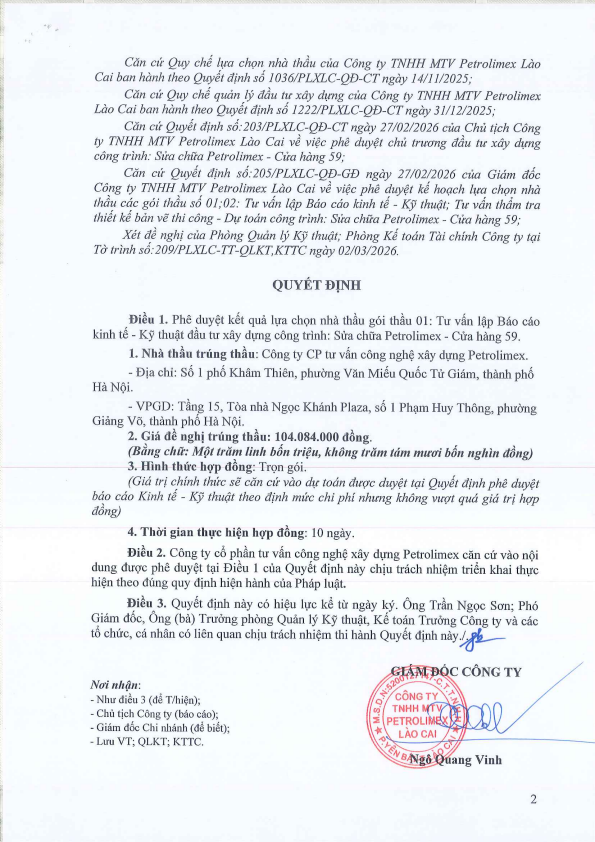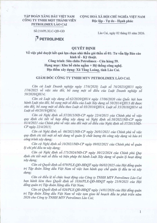 QĐ V/v phê duyệt Kết quả lựa chọn nhà thầu gói thầu số 01: Tư vấn lập Báo cáo kinh tế-kỹ thuật. Công trình: Sửa chữa Petrolimex-CH59. Hạng mục: Khu bể chôn ngầm+hệ thống công nghệ. Địa điểm xây dựng: Xã Tằng Loỏng, tỉnh Lào Cai