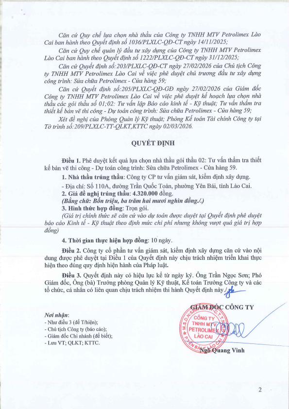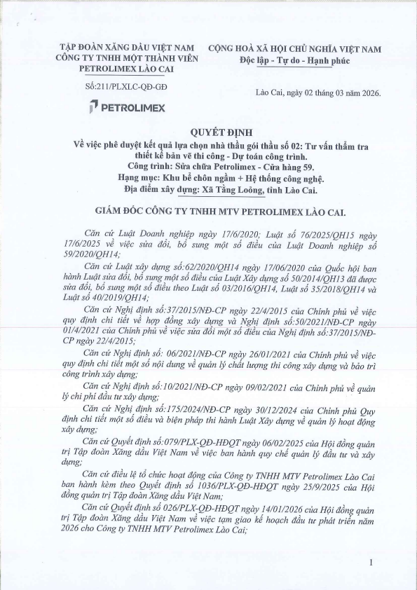 QĐ V/v phê duyệt Kết quả lựa chọn nhà thầu gói thầu số 02: Tư vấn thẩm tra thiết kế bản vẽ thi công- Dự toán công trình. Công trình: Sửa chữa Petrolimex-CH59. Hạng mục: Khu bể chôn ngầm+hệ thống công nghệ. Địa điểm xây dựng: Xã Tằng Loỏng,Lào Cai